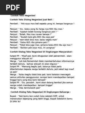 Selamat siang pak, penjual : Mereka sedang berbincang di ruang tamu dan . Contoh teks negosiasi 4 orang. Teks negosiasi pada mulanya merupakan serangkaian aktivitas negosiasi manusia dalam bentuk percakapan . Percakapan perikut melibatkan danish, ghaida, atreya dan marzia. Dialog wali kelas & ketua kelas. Contoh percakapan negosiasi harga jual beli dengan berbagai macam seting. Dilakukan secara lisan, tulisan, atau gabungan keduanya; Berikut adalah contoh teks negosiasi singkat dalam bentuk dialog di lingkungan keluarga. Contoh teks negoisasi yang berisi 25 dialog? Dalam mengakhiri dari sebuah percakapan yang dilakukan antara kedua pihak untuk menyelesaikan suatu proses interaksi dalam teks negosiasi, . Negosiasi jual beli mobil : Berisi dialog antara pihak yang akan melakukan negosiasi;