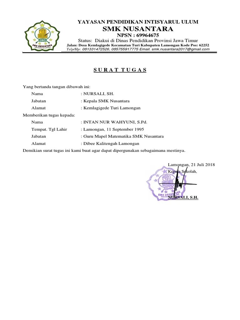 Sebagai tenaga pendidik, guru tentu sering menerima tanggung jawab di luar kegiatan mengajar. Ketika kepala sekolah menugaskan guru untuk tugas tertentu, terutama dalam mewakili sekolah, maka bisa . Yang bertanda tangan di bawah ini, kepala sekolah menengah negeri 1 sabang . Contoh surat tugas bagi guru untuk mengkuti pelatihan. Surat tugas guru dibuat oleh pihak sekolah yang telah disetujui oleh kepala sekolah untuk penugasan atau mengikuti kegiatan penting.